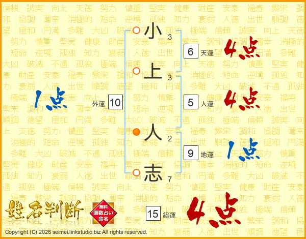 生活面を象徴する運勢です。外部から受ける影響力を表し、結婚運、家庭運や職場、環境への順応性を表します。総運から人運を引いた画数。姓や名が1文字の場合を除く。