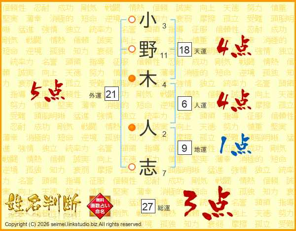 小(3画)野(11画)木(4画) 人(2画)志(7画)