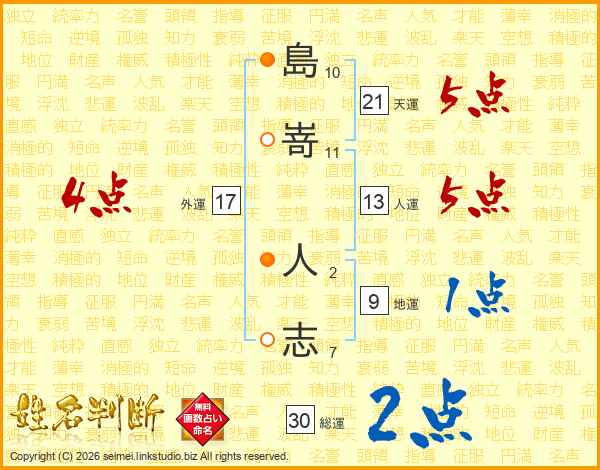 島嵜人志さんの総運は30画の2点!