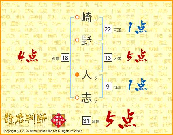 あなたの人生を表す1番重要な運勢です。生涯を通じて影響する総合運となり、主に50歳以降の晩年期に影響を及ぼします。苗字と名前の合計画数。