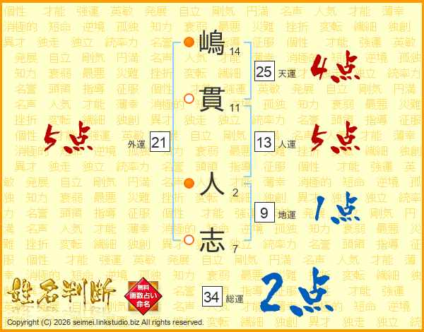 嶋(14画)貫(11画) 人(2画)志(7画)