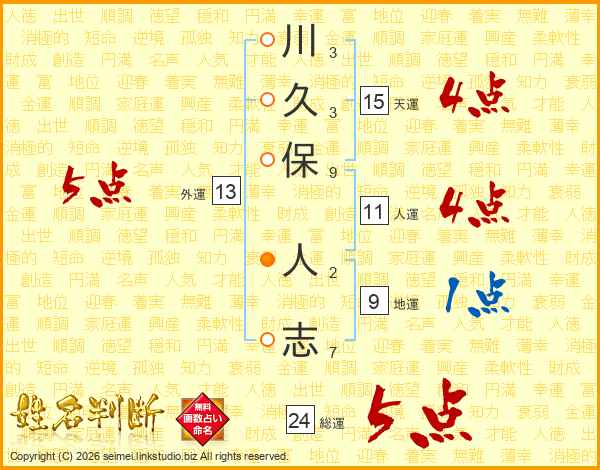 川(3画)久(3画)保(9画) 人(2画)志(7画)