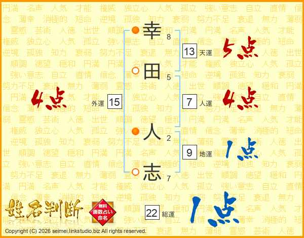 幸(8画)田(5画) 人(2画)志(7画)