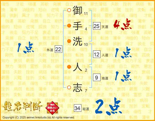 生活面を象徴する運勢です。外部から受ける影響力を表し、結婚運、家庭運や職場、環境への順応性を表します。総運から人運を引いた画数。姓や名が1文字の場合を除く。