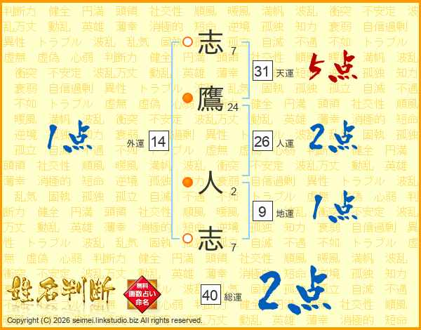 あなたの人生を表す1番重要な運勢です。生涯を通じて影響する総合運となり、主に50歳以降の晩年期に影響を及ぼします。苗字と名前の合計画数。