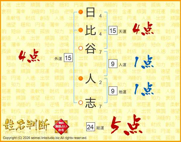 日(4画)比(4画)谷(7画) 人(2画)志(7画)