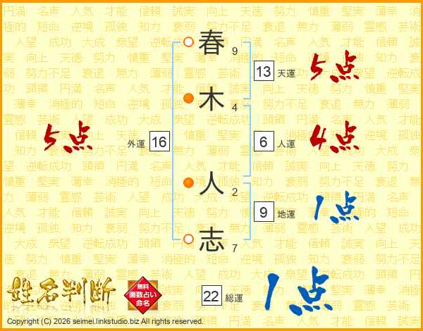 春(9画)木(4画) 人(2画)志(7画)