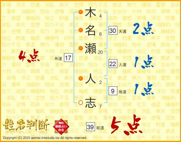 木名瀬人志さんの総運は39画の5点!