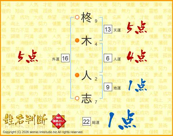 あなたの人生を表す1番重要な運勢です。生涯を通じて影響する総合運となり、主に50歳以降の晩年期に影響を及ぼします。苗字と名前の合計画数。