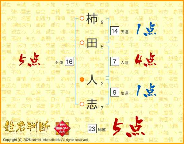 生活面を象徴する運勢です。外部から受ける影響力を表し、結婚運、家庭運や職場、環境への順応性を表します。総運から人運を引いた画数。姓や名が1文字の場合を除く。