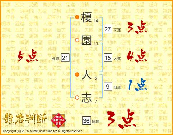 生活面を象徴する運勢です。外部から受ける影響力を表し、結婚運、家庭運や職場、環境への順応性を表します。総運から人運を引いた画数。姓や名が1文字の場合を除く。