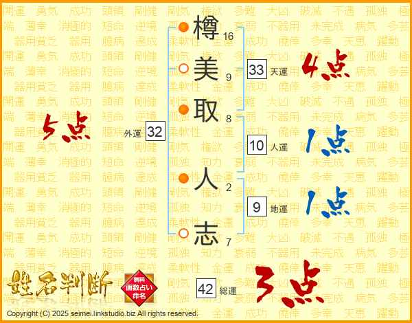 樽(16画)美(9画)取(8画) 人(2画)志(7画)