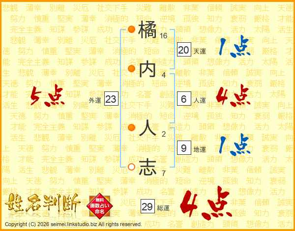 あなたの人生を表す1番重要な運勢です。生涯を通じて影響する総合運となり、主に50歳以降の晩年期に影響を及ぼします。苗字と名前の合計画数。