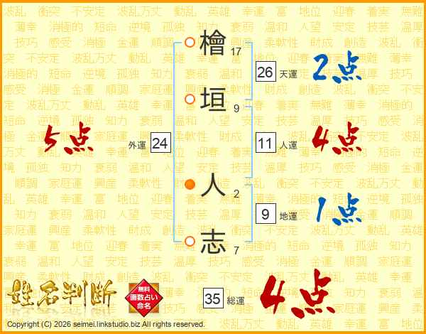 あなたの人生を表す1番重要な運勢です。生涯を通じて影響する総合運となり、主に50歳以降の晩年期に影響を及ぼします。苗字と名前の合計画数。