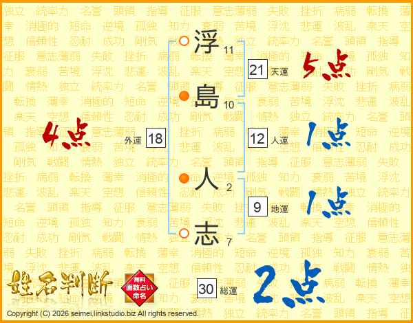 あなたの人生を表す1番重要な運勢です。生涯を通じて影響する総合運となり、主に50歳以降の晩年期に影響を及ぼします。苗字と名前の合計画数。
