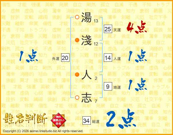 湯(13画)淺(12画) 人(2画)志(7画)
