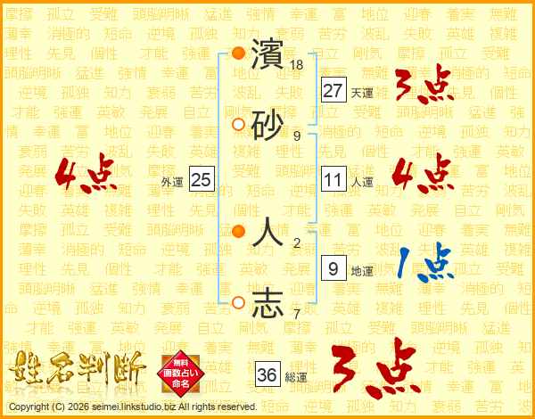 あなたの人生を表す1番重要な運勢です。生涯を通じて影響する総合運となり、主に50歳以降の晩年期に影響を及ぼします。苗字と名前の合計画数。