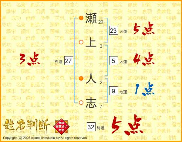生活面を象徴する運勢です。外部から受ける影響力を表し、結婚運、家庭運や職場、環境への順応性を表します。総運から人運を引いた画数。姓や名が1文字の場合を除く。
