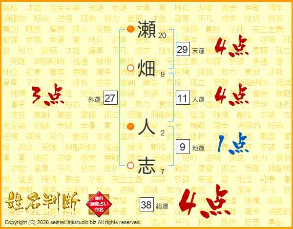 瀬(20画)畑(9画) 人(2画)志(7画)