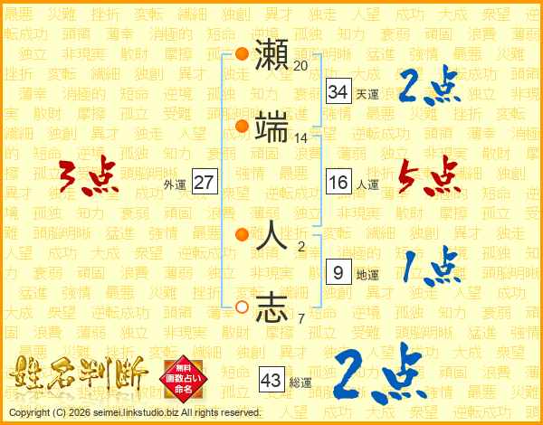 瀬端人志さんの総運は43画の2点!