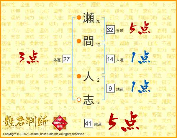 あなたの人生を表す1番重要な運勢です。生涯を通じて影響する総合運となり、主に50歳以降の晩年期に影響を及ぼします。苗字と名前の合計画数。