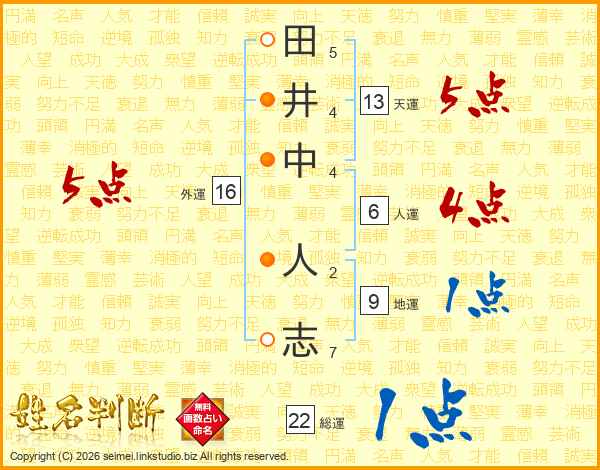 田(5画)井(4画)中(4画) 人(2画)志(7画)