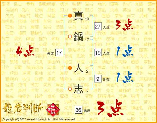 真(10画)鍋(17画) 人(2画)志(7画)