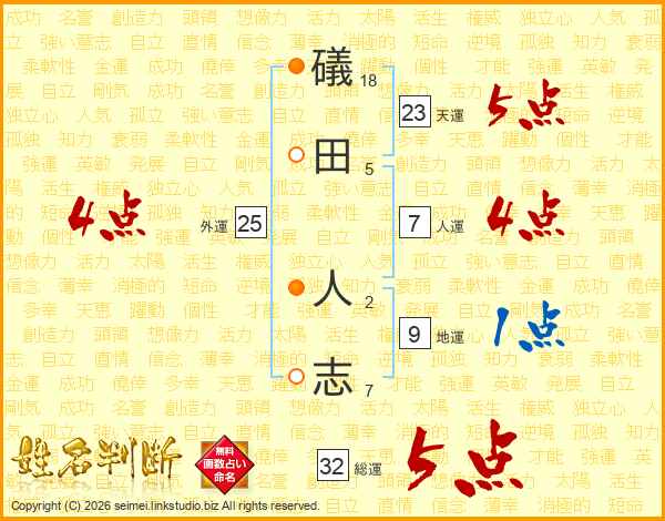 生活面を象徴する運勢です。外部から受ける影響力を表し、結婚運、家庭運や職場、環境への順応性を表します。総運から人運を引いた画数。姓や名が1文字の場合を除く。
