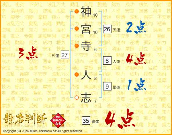 神(10画)宮(10画)寺(6画) 人(2画)志(7画)