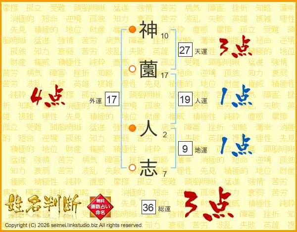 生活面を象徴する運勢です。外部から受ける影響力を表し、結婚運、家庭運や職場、環境への順応性を表します。総運から人運を引いた画数。姓や名が1文字の場合を除く。