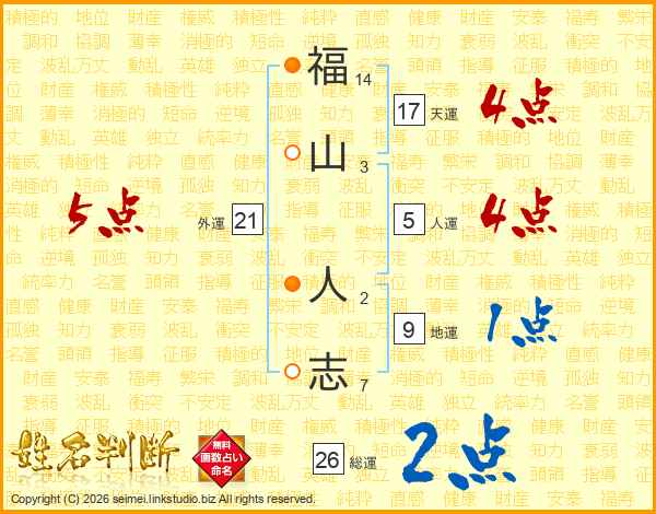 生活面を象徴する運勢です。外部から受ける影響力を表し、結婚運、家庭運や職場、環境への順応性を表します。総運から人運を引いた画数。姓や名が1文字の場合を除く。