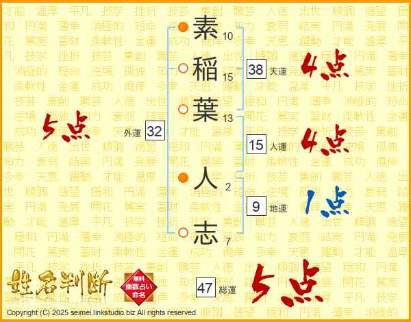 素(10画)稲(15画)葉(13画) 人(2画)志(7画)
