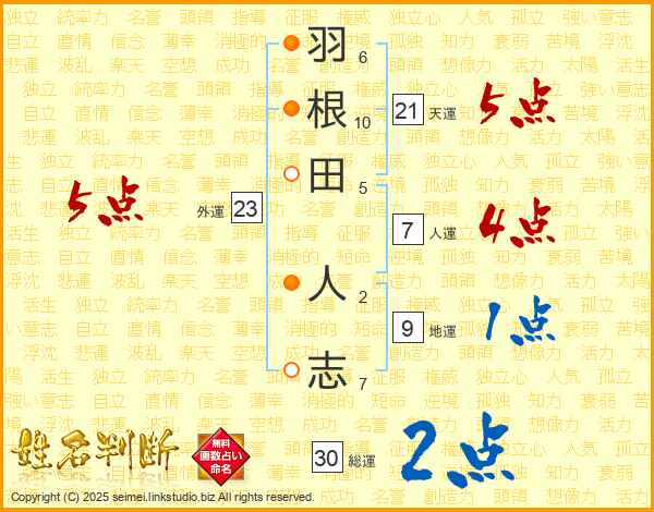 羽(6画)根(10画)田(5画) 人(2画)志(7画)