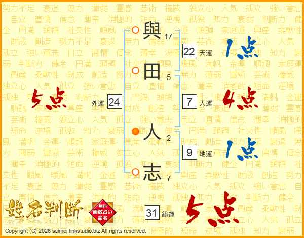 生活面を象徴する運勢です。外部から受ける影響力を表し、結婚運、家庭運や職場、環境への順応性を表します。総運から人運を引いた画数。姓や名が1文字の場合を除く。