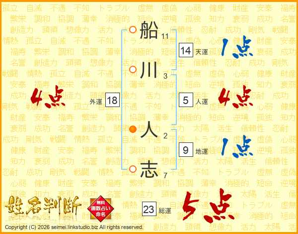 生活面を象徴する運勢です。外部から受ける影響力を表し、結婚運、家庭運や職場、環境への順応性を表します。総運から人運を引いた画数。姓や名が1文字の場合を除く。