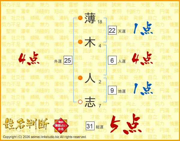 薄(18画)木(4画) 人(2画)志(7画)