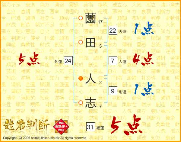 生活面を象徴する運勢です。外部から受ける影響力を表し、結婚運、家庭運や職場、環境への順応性を表します。総運から人運を引いた画数。姓や名が1文字の場合を除く。