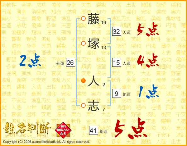 あなたの人生を表す1番重要な運勢です。生涯を通じて影響する総合運となり、主に50歳以降の晩年期に影響を及ぼします。苗字と名前の合計画数。