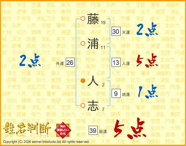 あなたの人生を表す1番重要な運勢です。生涯を通じて影響する総合運となり、主に50歳以降の晩年期に影響を及ぼします。苗字と名前の合計画数。