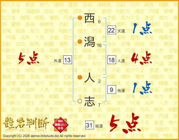 生活面を象徴する運勢です。外部から受ける影響力を表し、結婚運、家庭運や職場、環境への順応性を表します。総運から人運を引いた画数。姓や名が1文字の場合を除く。