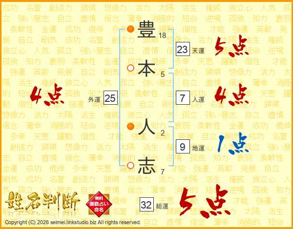 豊(18画)本(5画) 人(2画)志(7画)
