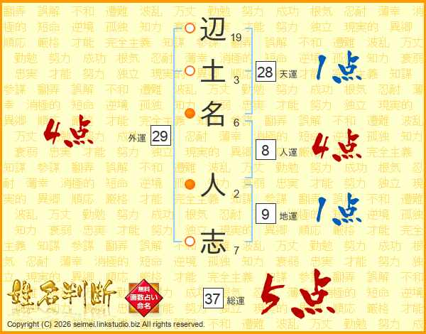 辺(19画)土(3画)名(6画) 人(2画)志(7画)