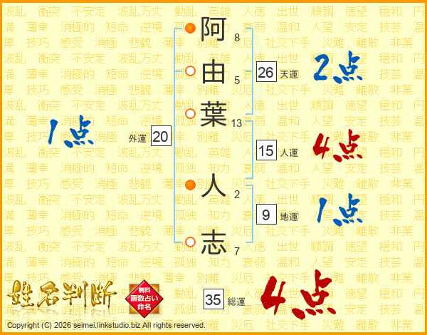 阿(8画)由(5画)葉(13画) 人(2画)志(7画)