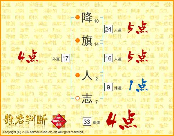 あなたの人生を表す1番重要な運勢です。生涯を通じて影響する総合運となり、主に50歳以降の晩年期に影響を及ぼします。苗字と名前の合計画数。