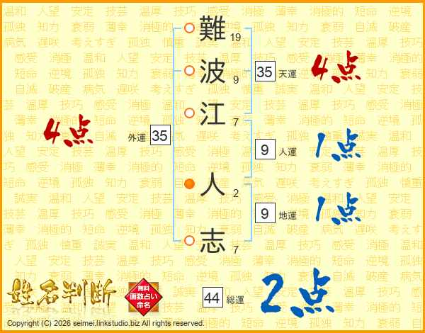 難(19画)波(9画)江(7画) 人(2画)志(7画)
