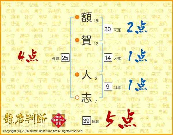 あなたの人生を表す1番重要な運勢です。生涯を通じて影響する総合運となり、主に50歳以降の晩年期に影響を及ぼします。苗字と名前の合計画数。