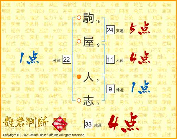 駒屋人志さんの総運は33画の4点!
