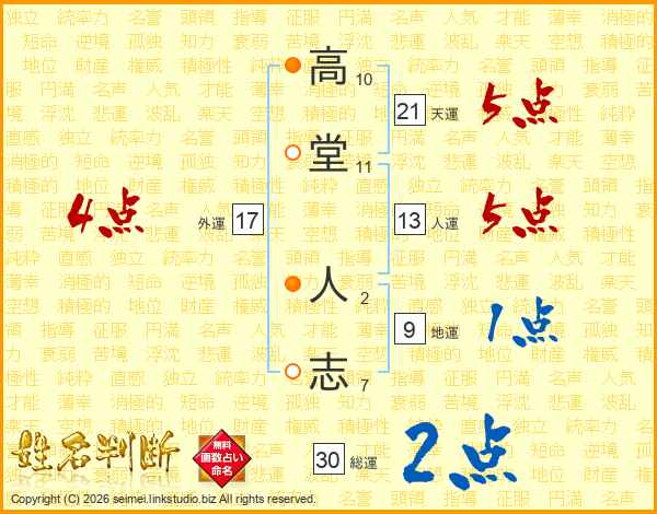 高(10画)堂(11画) 人(2画)志(7画)