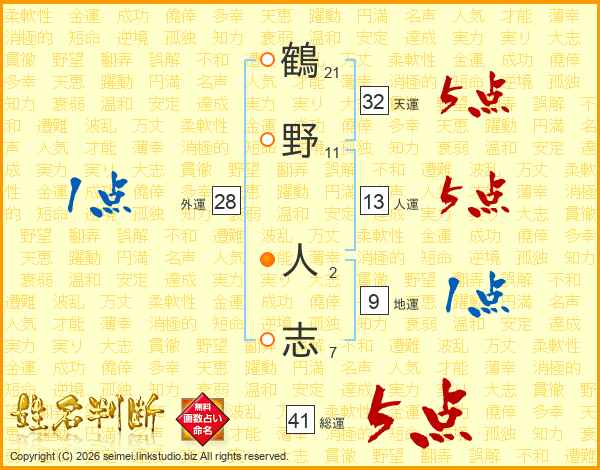 鶴野人志さんの総運は41画の5点!