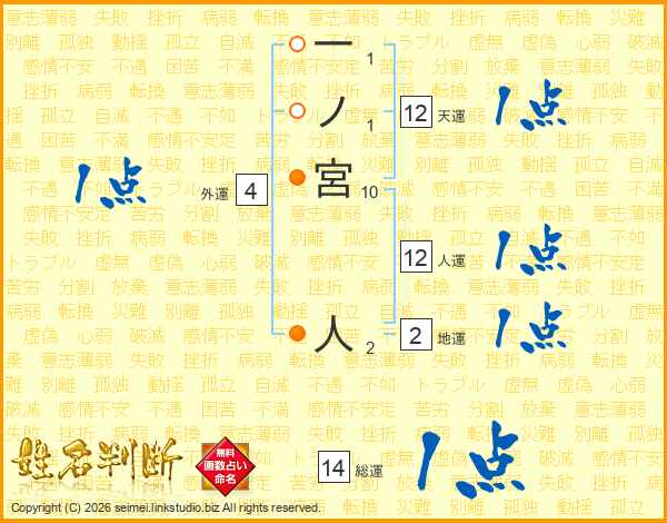 一(1画)ノ(1画)宮(10画) 人(2画)
